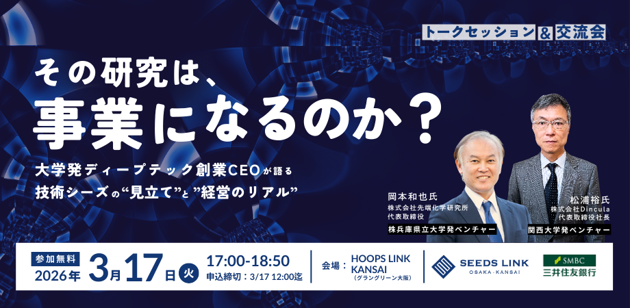 【イベント情報更新】3/17(火)開催「その研究は、事業になるのか? — 大学発ディープテック創業CEOが語る、技術シーズの ”見立て” と ”経営のリアル”」